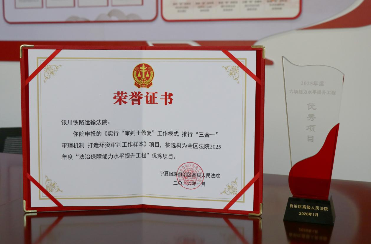 1月27日下午,在全区法院院长会上,银川铁路运输法院 “实行‘审判 + 修复’工作模式,推行‘三合一’审理机制,打造环资审判工作样本” 项目,获评 “六项能力水平提升工程”2025年度优秀项目,也是继2023年获评该奖项后,再次斩获此项殊荣。银川铁路运输法院分党组成员、副院长朱武获评 “全区法院工作先进个人”,并作为荣誉天平纪念章获得者代表上台领奖。