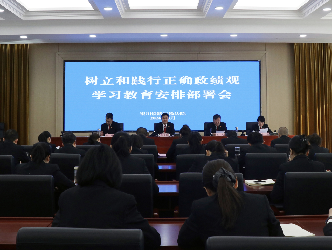 近日,银川铁路运输法院召开树立和践行正确政绩观学习教育安排部署会,深入学习贯彻习近平总书记关于树立和践行正确政绩观的重要论述,传达学习党中央、自治区关于开展树立和践行正确政绩观学习教育的部署要求,就全院开展树立和践行正确政绩观学习教育进行动员安排。全体干警参加会议。